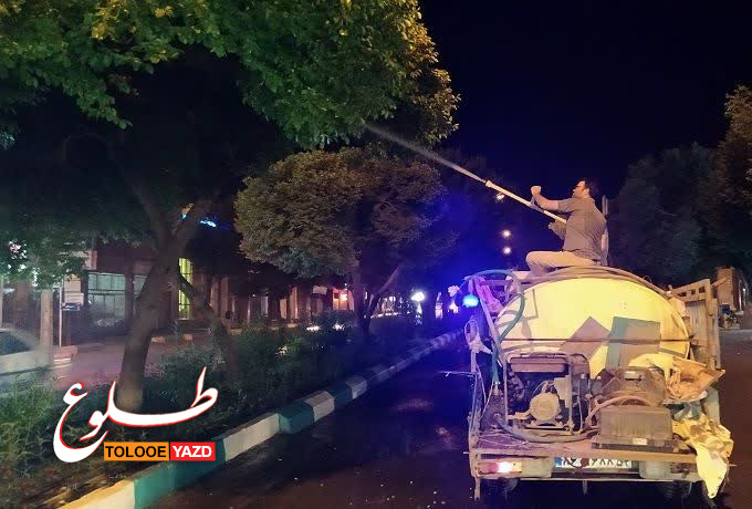 محلول پاشی و شستشوی شبانه درختان سطح شهر یزد