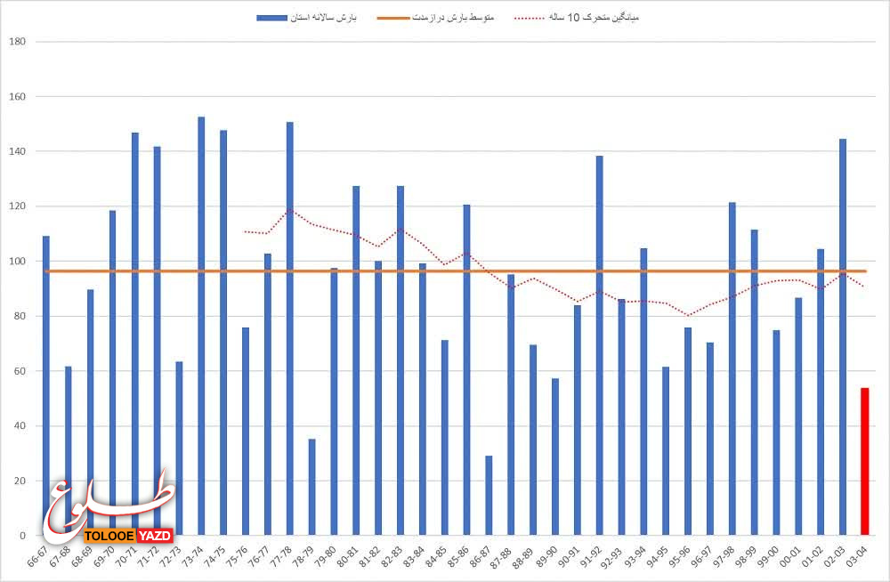 وی میزان بارندگی مدت مشابه سال آبی گذشته در استان را ۱۴۴ و متوسط دوره آماری را نیز ۹۶.۲ میلیمتر ذکر کرد و گفت: مقدار بارندگی ۵۳.۶ میلیمتری سال آبی جاری استان در شرایطی است که متوسط بارندگی کشور طی سال آبی جاری ۱۴۶.۵ میلیمتر بوده و استان یزد به لحاظ میزان بارندگی سال آبی جاری تاکنون رتبه ۲۹ را در بین ۳۱ استان کشور داراست.