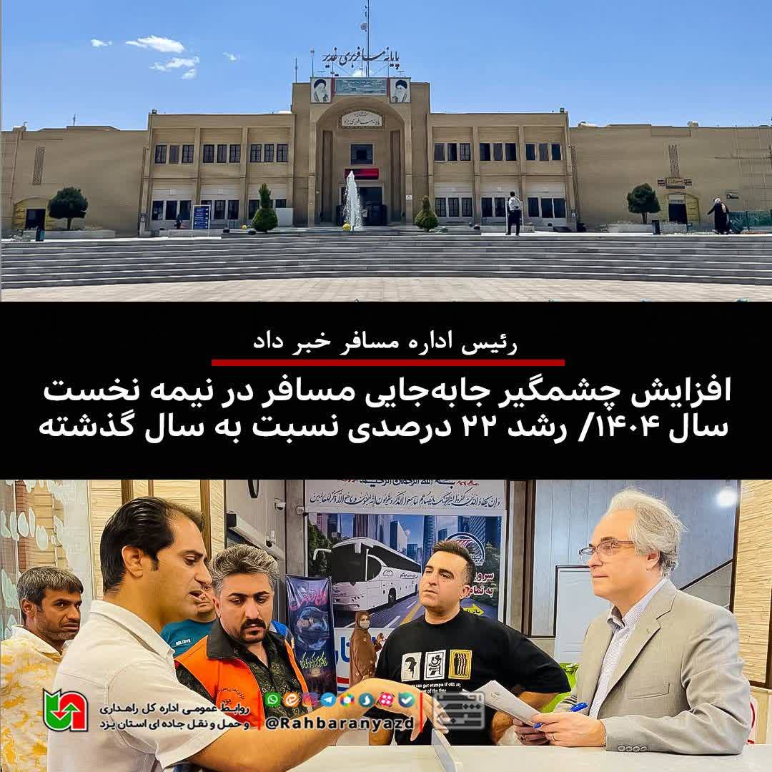 🔹رئیس اداره حملونقل مسافر اداره کل راهداری و حملونقل جادهای استان یزد گفت: میزان جابهجایی مسافر در ۶ماهه ابتدایی سال جاری با ۲۲ درصد افزایش به بیش از ۶۲۳ هزار نفر رسید.